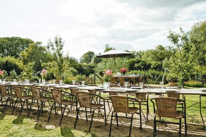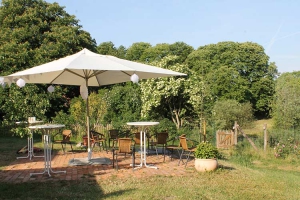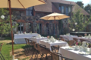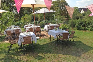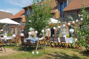 Direkt vor dem großen Saal befindet sich ein liebevoll gestalteter Garten mit Terrasse, in dem man natürlich auch essen und feiern kann – sehen Sie sich dazu bitte die Fotos in unserer Galerie an.