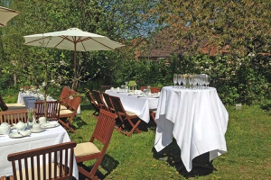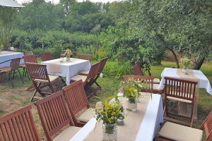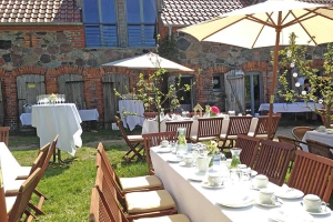 Direkt vor dem großen Saal befindet sich ein liebevoll gestalteter Garten mit Terrasse, in dem man natürlich auch essen und feiern kann – sehen Sie sich dazu bitte die Fotos in unserer Galerie an.